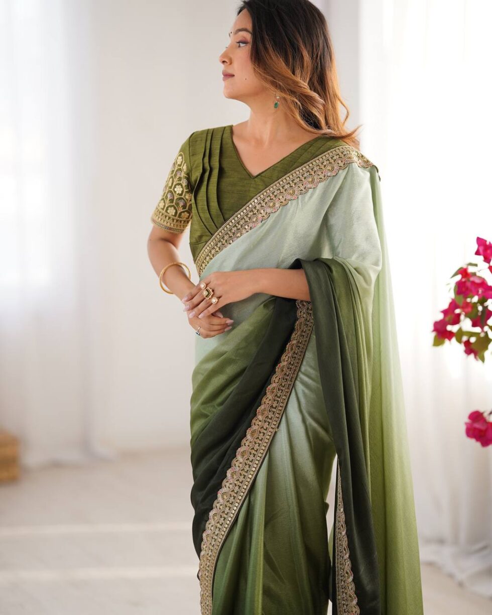 Chinon Silk saree with thread and sequence lace work, 5.5M cut, includes unstitched blouse. Priced at ₹4,399.00.